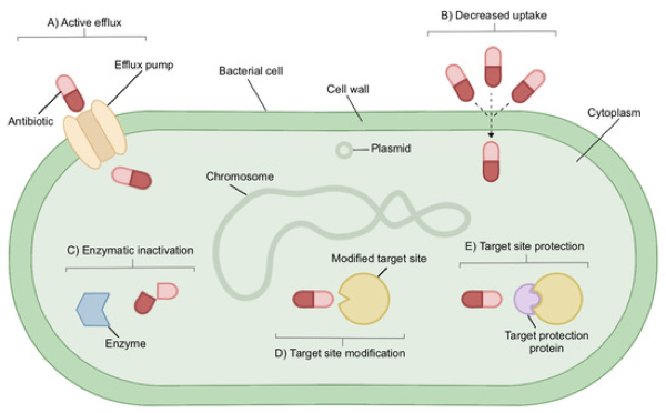 Les mécanismes bactériens de résistance sont multiples: activation de pompes à efflux expulsant l’antibiotique, le cytoplasme devient imperméable à l’antibiotique, la bactérie commence à produire une enzyme qui inactive l’antibiotique, modification de la cible antibiotique ou production de protéines de protection.