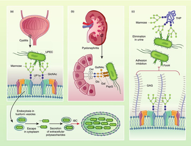 - D-mannose: ce sucre simple, excrété intact dans les urines, agit comme inhibiteur compétitif de l’adhésion des E. coli (notamment via leurs fimbriae de type 1) aux cellules urothéliales. Son efficacité prophylactique a été rapportée comme comparable à celle des antibiotiques dans certaines études (21), bien que l’ensemble des données reste faible et contradictoire.